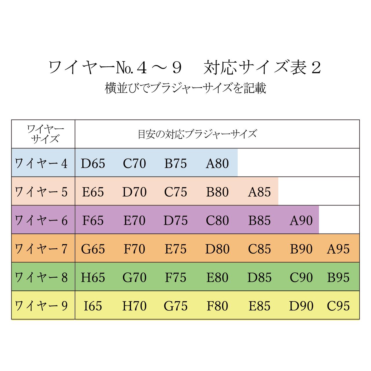 表より小さいサイズの方・・・ワイヤーの1番、2番もありますが、ワイヤー巾(横方向の巾)が狭くなりすぎるので、4番を使用して高さの低いカップパターンにすることをお勧めします。
