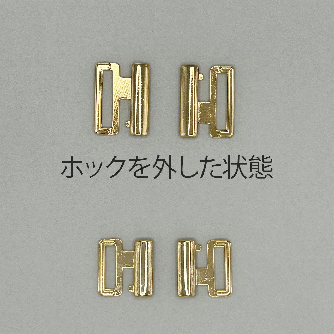 フロントホックブラに使用する金具。土台テープ巾に合わせて2種類の巾を揃えています。カラーはゴールド。フックアイのようにサイズ調整が出来ないのでアンダーサイズの許容範囲が広いデザインに向いています。