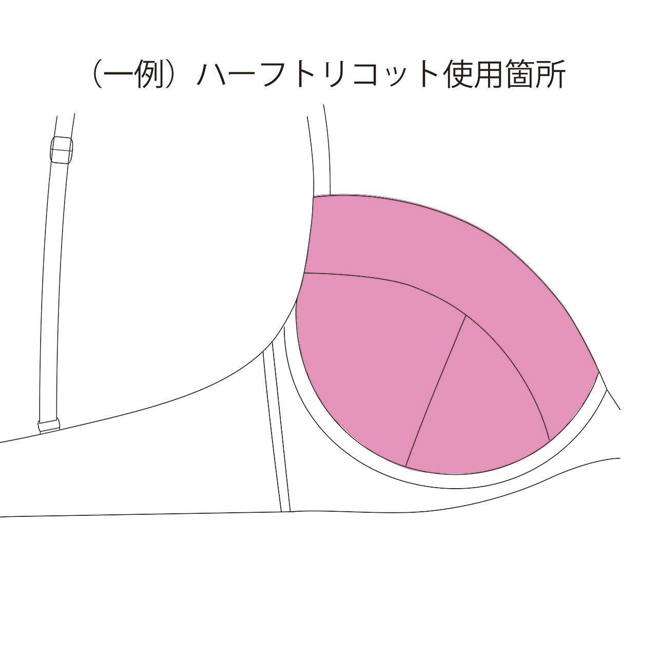 バックハーフはハーフトリコットとも言い、経編(タテアミ)機で作られた、薄さと融通性を併せ持った生地です。伸びませんが編み地なりのストレッチ性があり、当て布として肌馴染みを持たせたい部分に使用します。またレースの透け感を軽減したい時も当て布として使用します。